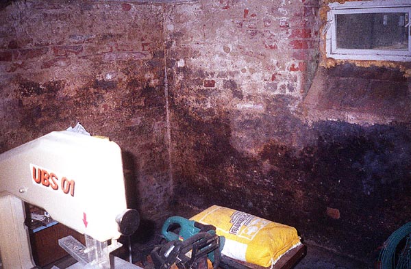 Die Drainage geht erst um zwei Seiten des Hauses. Laut Expertenmeinung ist diese feuchte Wand mit einer kompletten Drainage + ausreichend Lüftung wegzubekommen.